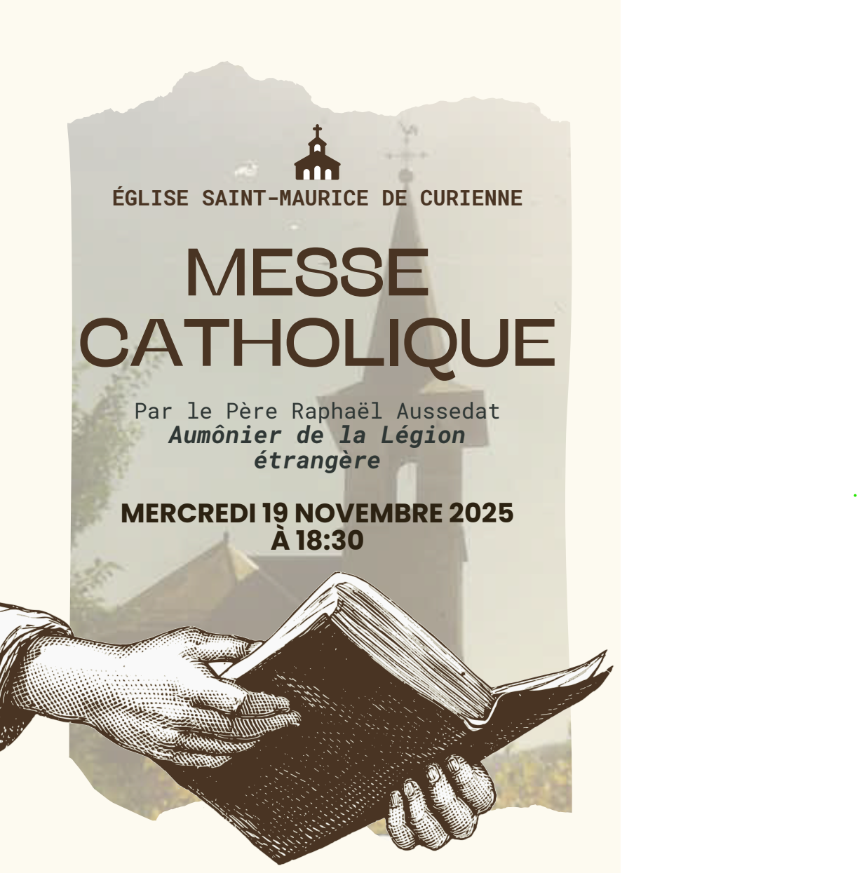 Une messe catholique se tiendra ce soir, à 18h30, à l’église Saint-Maurice de Curienne. Elle sera célébrée par le Père Raphaël Aussedat, aumônier à la légion étrangère, qui est présente sur la commune depuis quelques jours pour un exercice militaire.