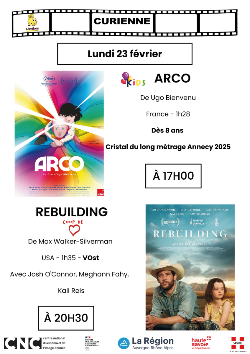 15 février 2026 - Dans Actualités‚ Vie associative Cinébus séances du mois de février Les séances proposées par Cinébus pour le mois de février.Lundi 23 février :ARCO à 17h00REBUILDING à 20h30 Précédent IMPORTANT – Élections municipales
